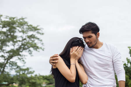 Young handsome boyfriend hugging his girlfriend, she was sad and upset.