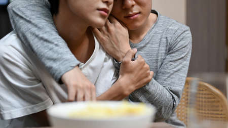 Romantic love affection of asian gay men couple. A man hugging or cuddling his gay lover, hand around his lover with passionate feeling. LGBT couple concept