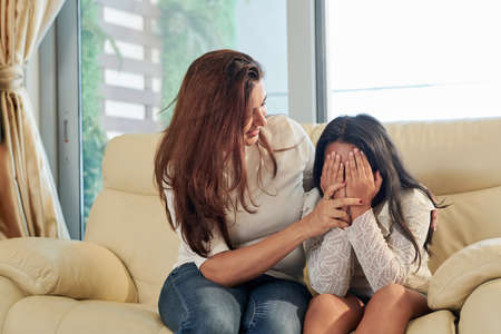 Young mother sitting on sofa together with her daughter and support her while she crying