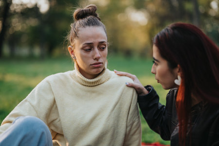 A compassionate woman comforts her sad friend by placing a comforting hand on her shoulder. The close-up shot captures the emotion of empathy, support, and friendship during a difficult time.