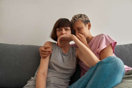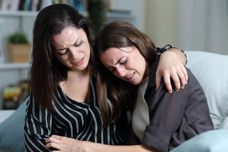 Two sad friends or sisters crying together on a couch in the living room at home