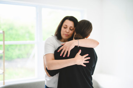 mother comforting depressed sad teen girl, hugging daughter with love
