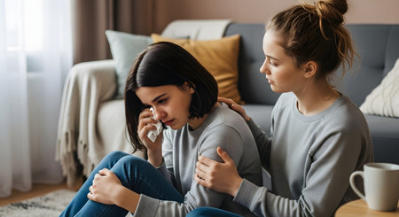 A caring young woman comforts her crying friend who is sitting on the floor holding a tissue. The scene depicts emotional support, empathy, and friendship during a difficult time in a home environment.