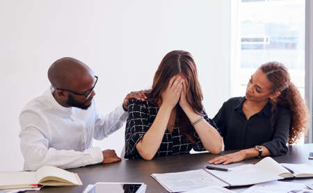 Dont worry itll be okay. a young businesswoman in distress being comforted by her coworkers.