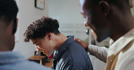 Young stressed man touching head while one of attendants keeping hand on his shoulder and supporting him during psychological session