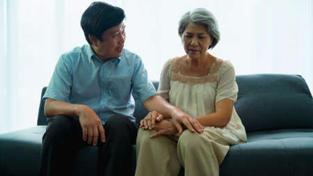 Man questioning his elderly mother's health problems in the living room at house. His mother had health problems with knee joints. Son encourages mom about health problems.