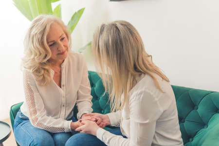 Hands of young kind woman holding those of mature female in casualwear