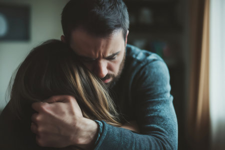 Man is embracing his sad partner, offering comfort and support during a difficult time at home