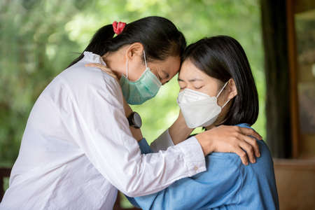 Asian mom and daughter concept, hugging and caring