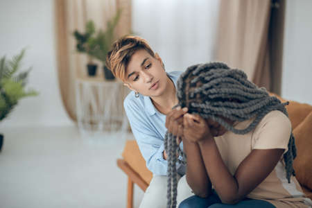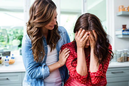 Woman comforting worried friend at home