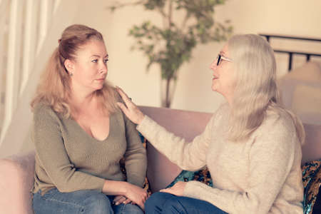 Caring daughter comforting frustrated unhappy senior woman. Loving adult granddaughter talking to sad depressed old grandmother holding hand and comforting her. Upset widowed woman with headache consoled by her daughter.