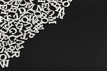 White letters of English alphabet in random order on black background. text background. Copy space. Template. Mockup.