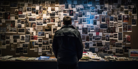 A man stands in front of a wall filled with black and white photos. This image can be used to represent nostalgia, memories, or the passage of time.