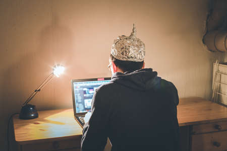Young man with aluminum cap is sitting in the dark basement in front of a laptop. Conspiracy theory concept