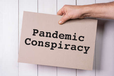 a sign with the words Pandemic conspiracy held in the hand