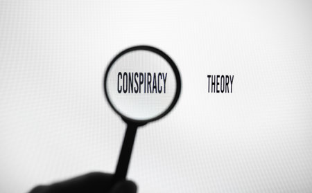 Phrase conspiracy theory on white screen through a magnifying glass.
