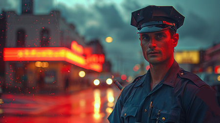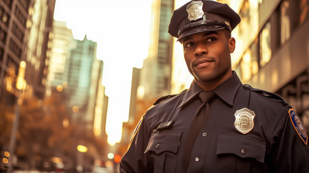 An African American police officer with a stoic expression stands against a fiery sunset, his silhouette casting a symbol of law in the glowing streets, as evening lights begin to shimmer behind. A.I.