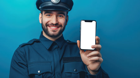 A handsome police officer invites men and women to serve. A confident, successful policeman holds a cell phone in his hand with an empty screen on a blue background. Phone mockup. A mobile app for police officers