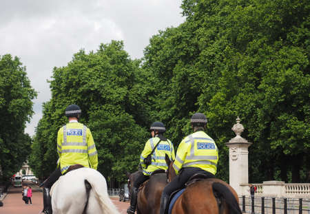 LONDON, UK - CIRCA JUNE 2017: Mounted metropolitan police officers patrol on horseback on the Strand