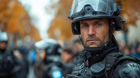 A strong and determined policeman in full body armor and a tactical vest, standing confidently against a black background. safety, law enforcement, and personal security services