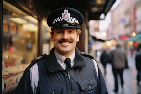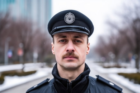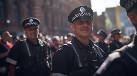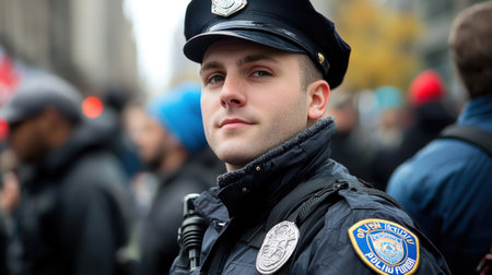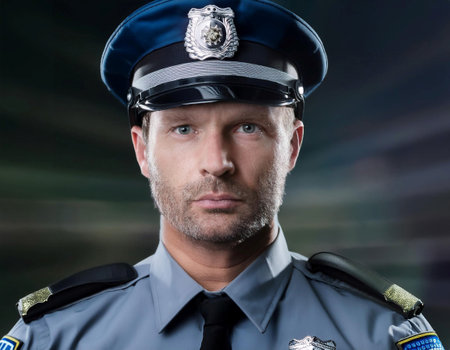 Close up image of a police officer in uniform, symbolizing law enforcement, security, and public service.
