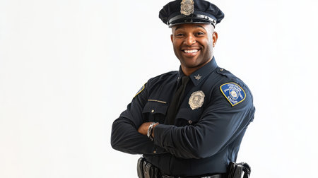 Against a crisp white background, a friendly policeman showcases a genuine smile, reinforcing the importance of community relationships and public safety initiatives.