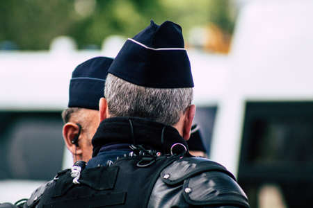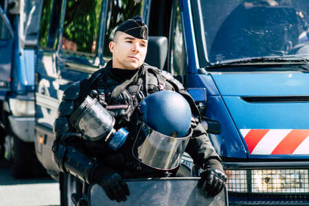 Paris France May 11, 2019 Portrait of a riot squad of the French National Police in intervention during protests of the Yellow Jackets against the policy of President Macron in Paris on saturday afternoon