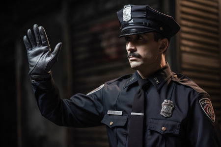 Police officer in uniform raises hand to signal stop. Generative AI.