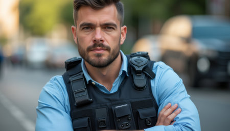 A strong, confident male police officer stands with his arms crossed, wearing tactical gear and a light blue shirt. His serious expression and professional attire convey authority and readiness, embodying the dedication of law enforcement.