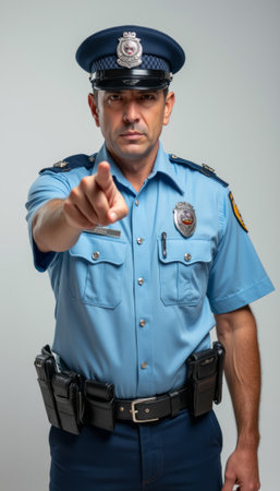 Confident police officer pointing directly at the camera