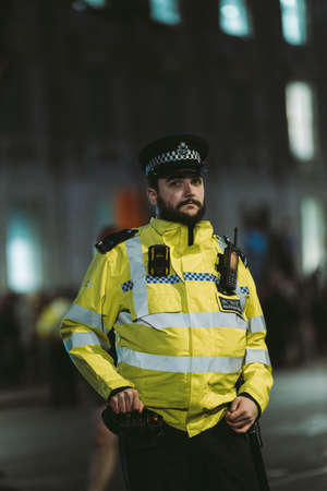 Police officer in hi-visibility jacket policing crowd control at a UK event