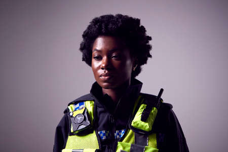 Studio Portrait Of Serious Young Female Police Officer Against Plain Background