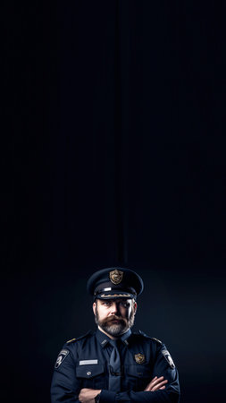 Policeman standing against a black background in a vertical composition. Security guard in uniform, representing law enforcement and protection. Dramatic lighting emphasizing authority and duty.