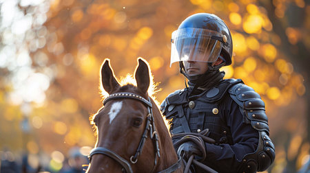 A mounted officer in gear leads a horse through a busy, vibrant autumn park