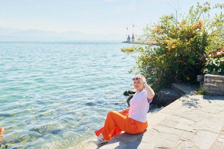 Outdoor fashion portrait of middle age 50 - 55 year old woman wearing colorful outfit, posing by the lake, travel and vacation lifestyle, image taken in Morges, Vaud, Switzerland