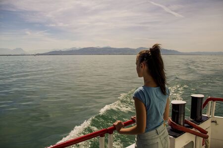 Asian beautiful woman is travel for holiday in the summer of Europe and taking a camera view landscape of lake and bright sky in Geneva Switzerland, copy space.