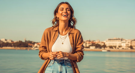 Joyful woman laughing outdoors by the sea, wearing a white top, blue jeans, and a brown blazer.