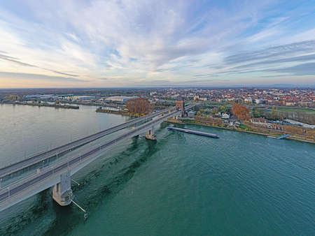 Aerial view of the Nibelungen Bridge in Worms with a view of the city gate during sunrise