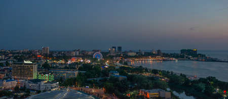 Beautiful night view of coastal city Anapa with river flowing into the sea on the sunset.