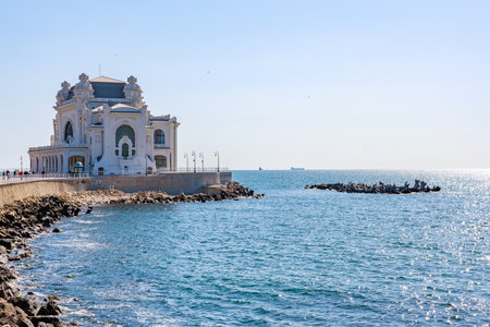Historic casino constanta on the black sea coastline in bright daylight.