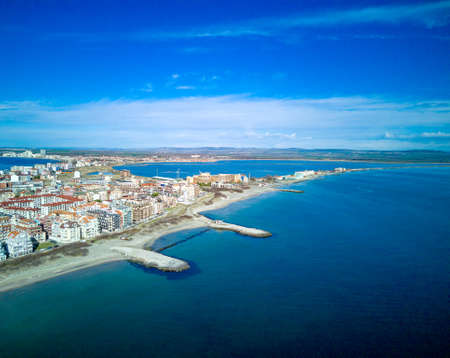 Sandy beach, concrete pier, clear sea water. Helicopter view