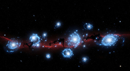 This image captures a stunning view of a galactic cluster in deep space. Multiple spiral galaxies are visible, each exhibiting vibrant colors and intricate structures. The central galaxy is the most prominent, surrounded by smaller galaxies in various stages of formation and interaction. The backdrop is filled with countless stars and distant celestial bodies, highlighting the vastness and beauty of the universe.