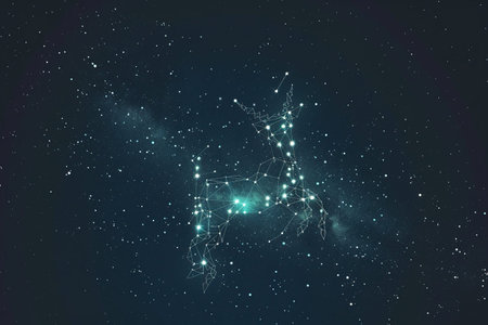 A beautiful illustration of a deer constellation with glowing stars connected by lines against a dark blue night sky background. Abstract astrological concept with copy space.
