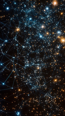 A cinematic night sky filled with stars and glowing geometric lines connecting celestial points. Represents global networking, artificial intelligence, data mapping, and cosmic interconnectedness.