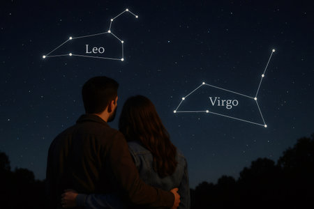 Couple embracing under a starry night sky, marveling at the Leo and Virgo constellations, sharing a moment of love and connection