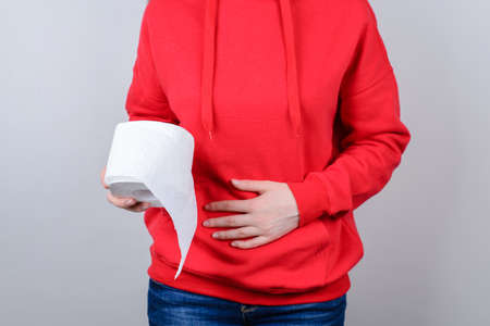 People with stomach problems holding toilet paper, Person with toilet paper with stomach problems on isolated background, Concept of a person with digestive problems