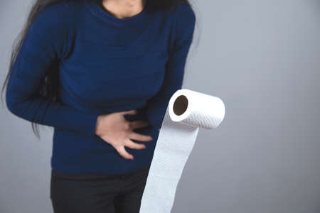Intestinal pain concept with a woman holding her stomach and a roll of toilet paper