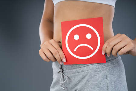Woman With Stomach Pain Showing Sad Sign On Red Piece Of Paper