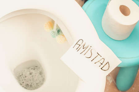Broken friendship concept. Paper with the word friendship in Spanish on the edge of a toilet.