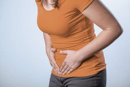 Unrecognizable young caucasian woman standing in the bathroom and feeling pain in the stomach